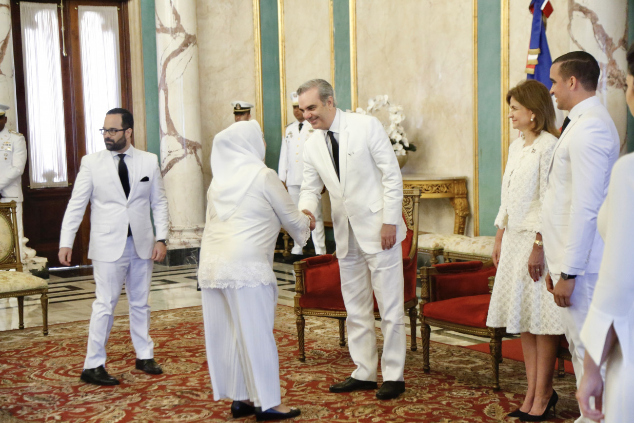 El acto protocolar se efectuó en el Salón de Embajadores del Palacio Nacional, donde el jefe de Estado estuvo acompañado de la vicepresidenta de la República, Raquel Peña, el viceministro de Relaciones Exteriores, José Julio Gómez.