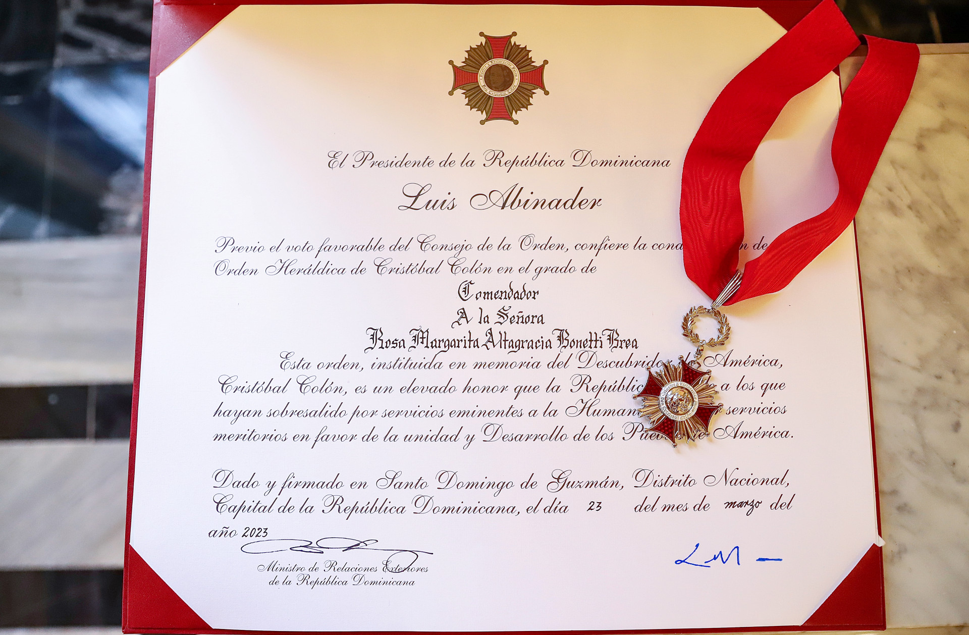 Presidente Abinader concede Orden Heráldica de Cristóbal Colón a la señora Rosa Margarita Bonetti
