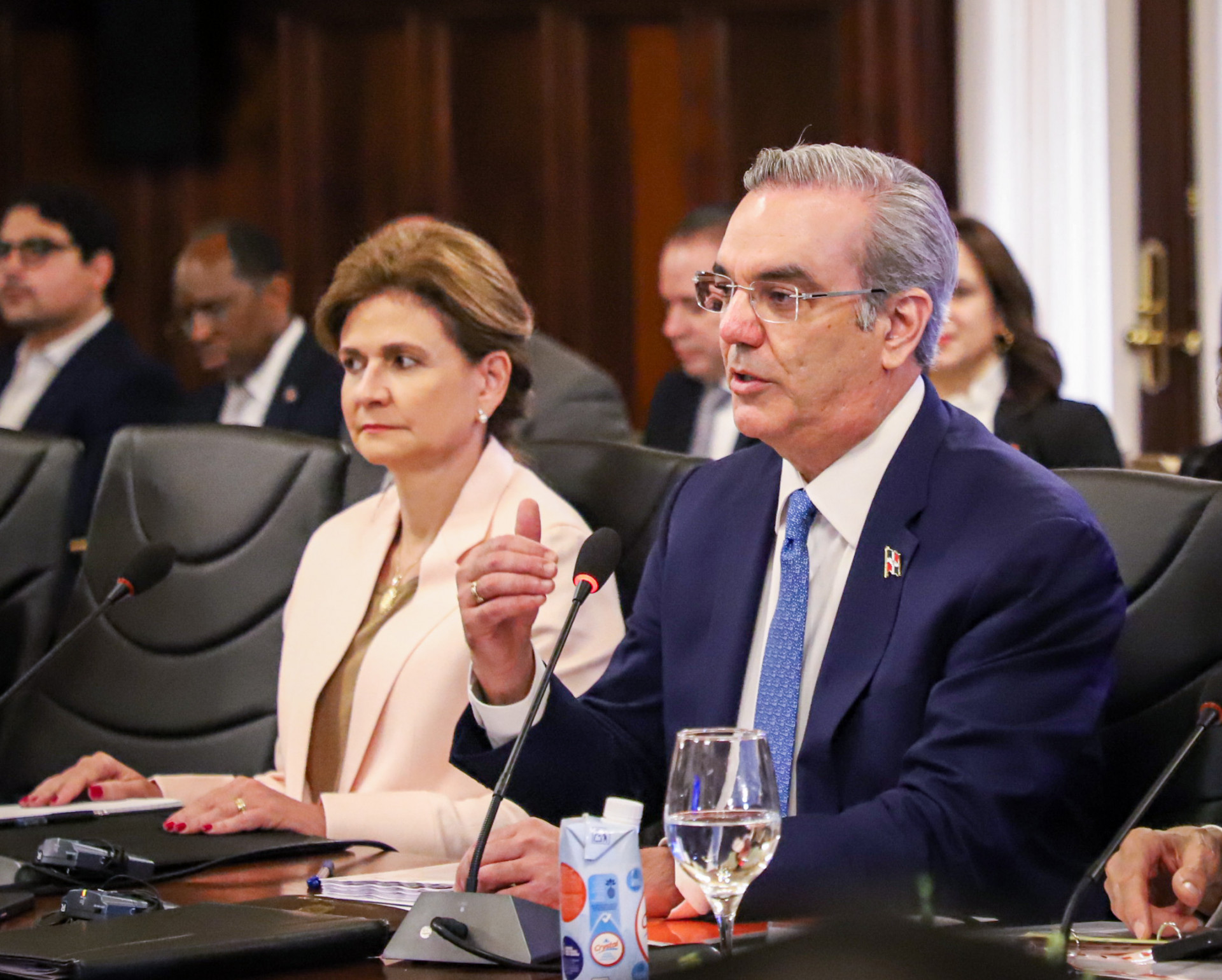 El presidente Luis Abinader junto con Mohamed Irfaan Ali, presidente de la República Cooperativa de Guyana 🇬🇾, encabezaron la reunión ampliada acompañados de las delegaciones de ambas naciones