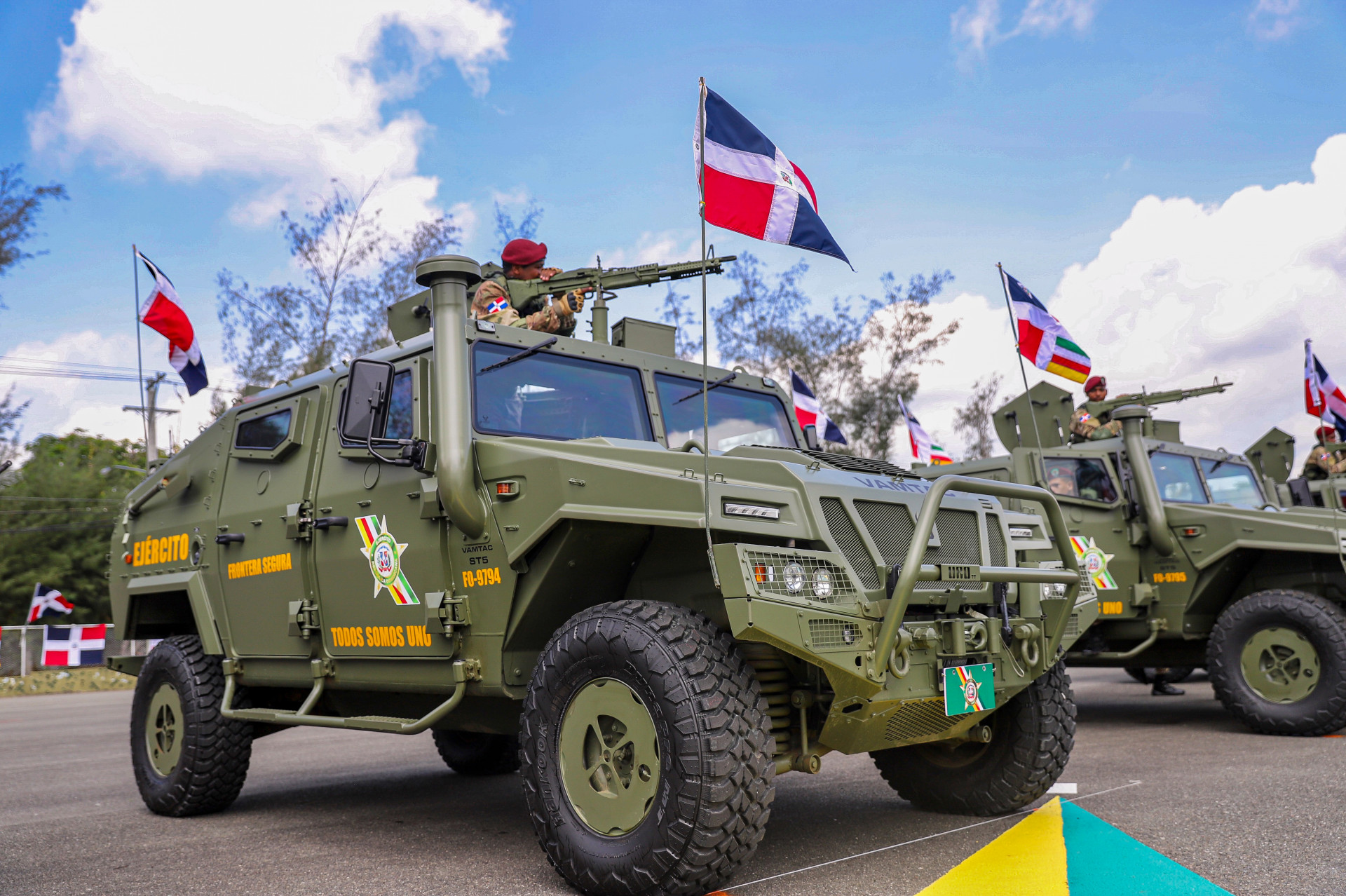 El presidente entrega 20 vehículos blindados de Alta Movilidad Táctico (VAMTAC), al ejército de la República Dominicana, que disponen de cámaras de alta definición en tiempo real y comunicación simultánea ante emergencias, los cuales fortalecerán este organismo militar, para proteger la integridad y soberanía de la nación.