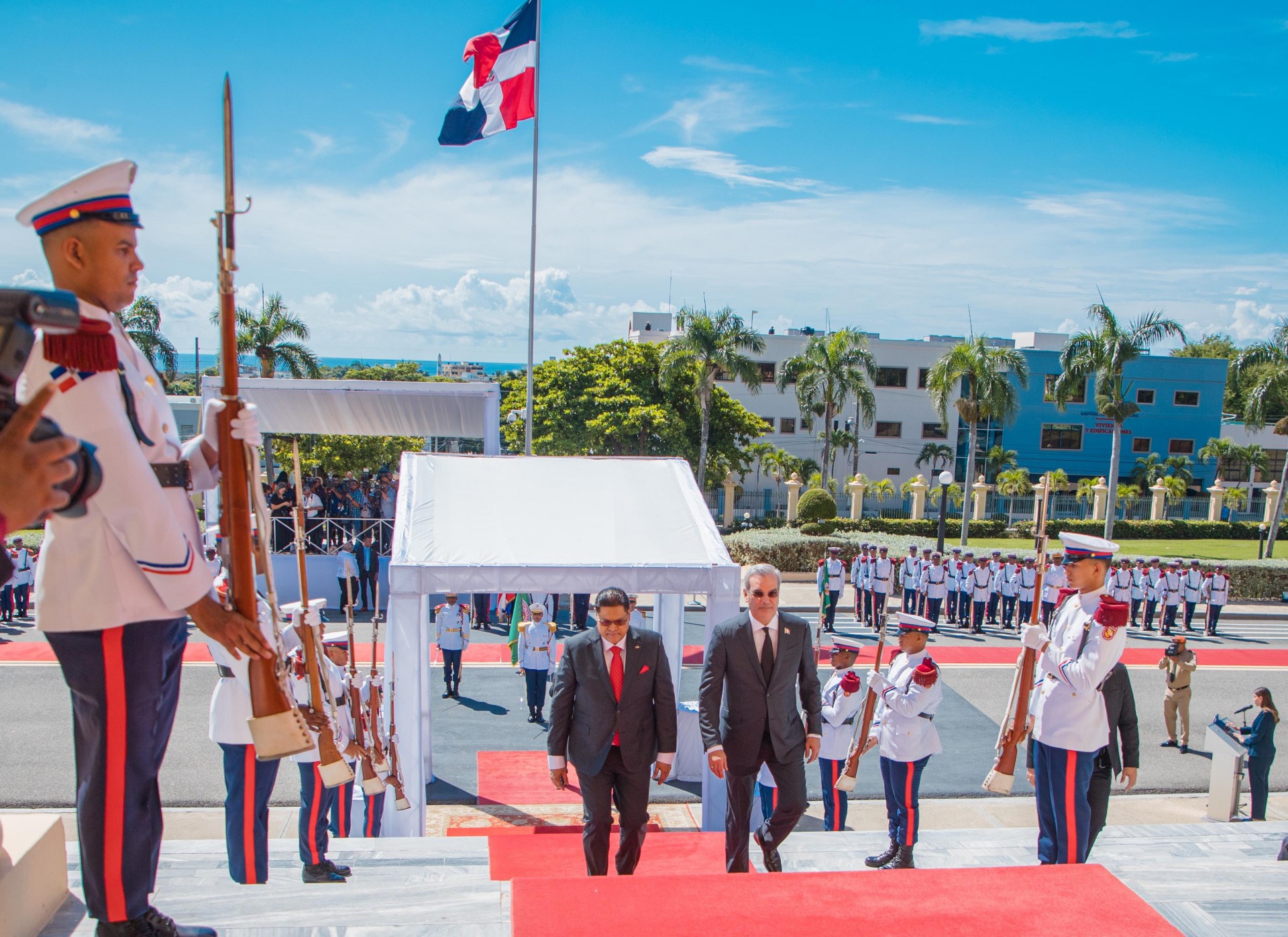 La ceremonia de recibimiento al mandatario de la República de Surinam estuvo encabezada por el presidente Abinader y se realizó en la explanada frontal del Palacio Nacional, a las 10:00 de la mañana.