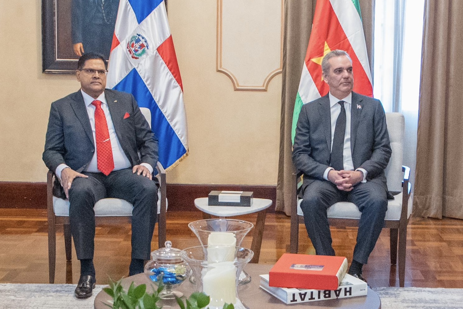 Santo Domingo.- El presidente Luis Abinader y su homólogo de la República de Surinam, Chandrikapersad Santokhi, encabezaron este jueves la firma de cuatro convenios históricos para el fortalecimiento económico del país, especialmente en áreas de energía, agricultura, industria de los hidrocarburos y servicios aéreos.