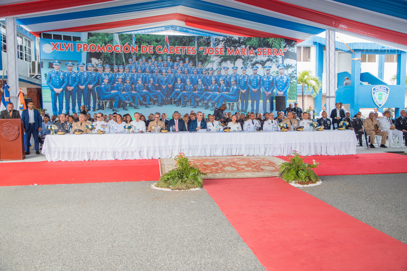 Hatillo, San Cristóbal. - El presidente Luis Abinader encabezó la cuadragésima sexta (XLVI) graduación de la Policía Nacional “Mayor General (r) José Félix Rafael Hermida González", donde 57 cadetes fueron ascendidos a rango de segundo teniente, de estos 13 son femeninas y 44 masculinos.