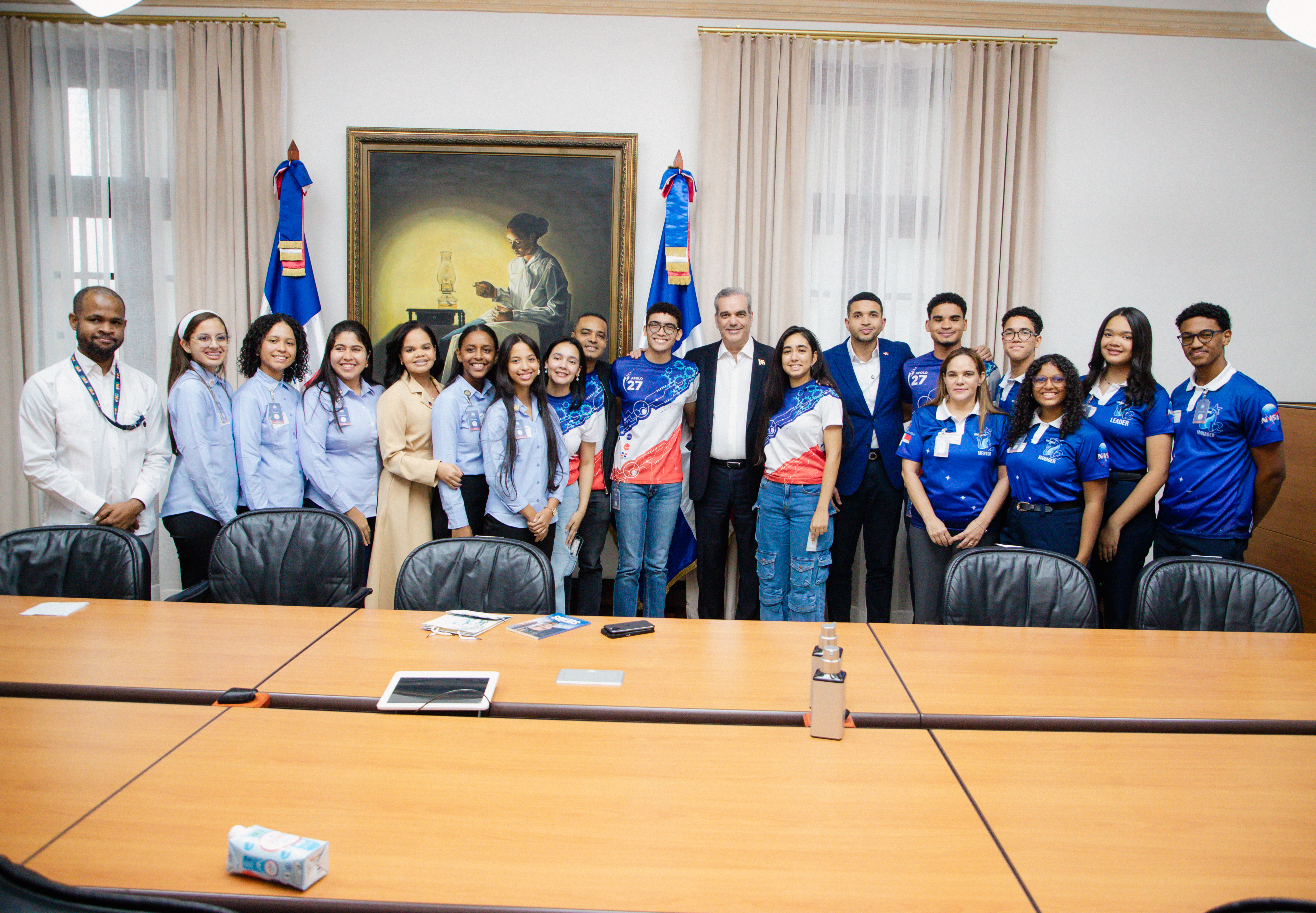 Santo Domingo.- El presidente Luis Abinader recibió en el Palacio Nacional a 12 estudiantes de los niveles universitario y secundario que participan en el concurso anual NASA Human Exploration Rover Challenge, organizado por la Administración Nacional de Aeronáutica y el Espacio (NASA).