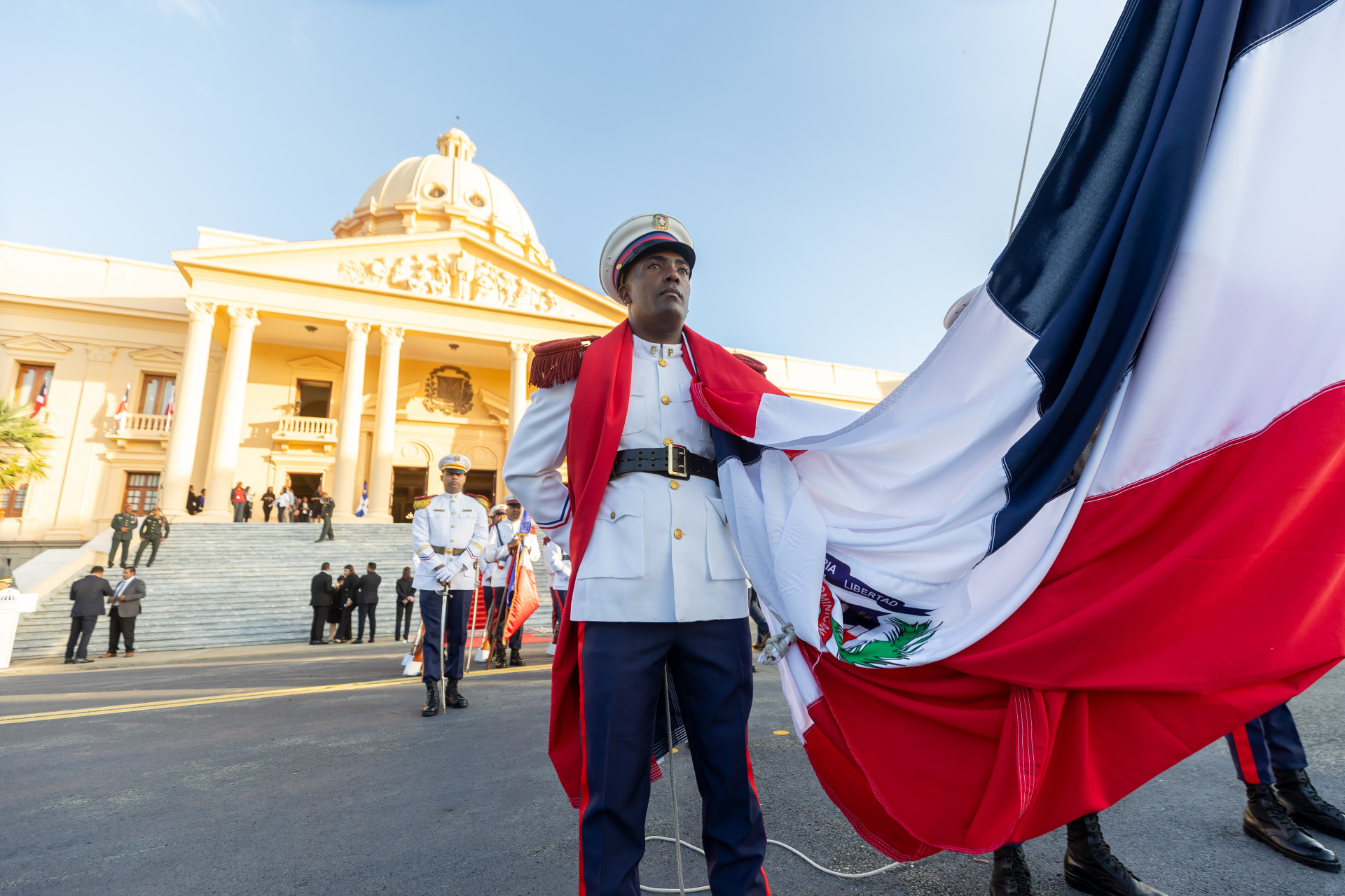 “Este acto es la solemnidad que encabeza el señor presidente de la República en su condición de primero entre sus iguales y de ciudadano de la República, que acompañado de los servidores públicos le rinde homenaje solemne, agradecido y amoroso a nuestra insignia tricolor, nada más y nada menos que en el asiento del poder institucional, constitucional e histórico de un país y ese país es la República Dominicana”, expresó Uribe.