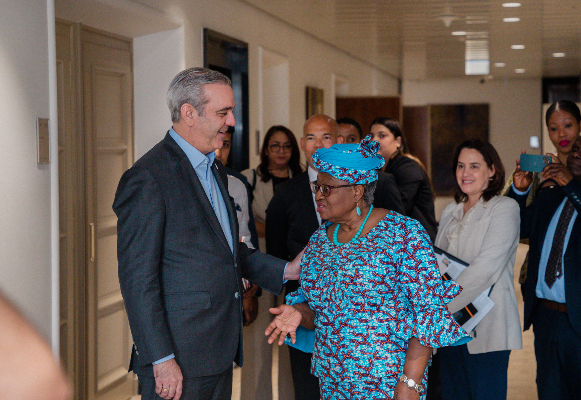 Durante un encuentro sostenido por la funcionaria con el presidente Luis Abinader, quien la visitó en la sede del organismo, la doctora Ngozi Okonjo-Iweala, felicitó al mandatario por los avances que va teniendo la República Dominicana, tanto en negocio electrónico, como en la preservación del medio ambiente.