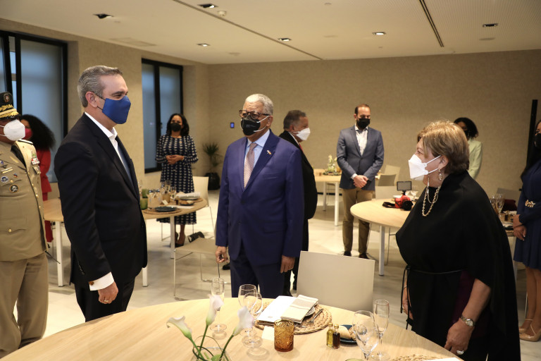 El Presidente Luis Abinader fue recibido por personalidades destacadas de la comunidad dominicana radicada en España, las cuales ofrecieron una cena en honor a la visita del mandatario.